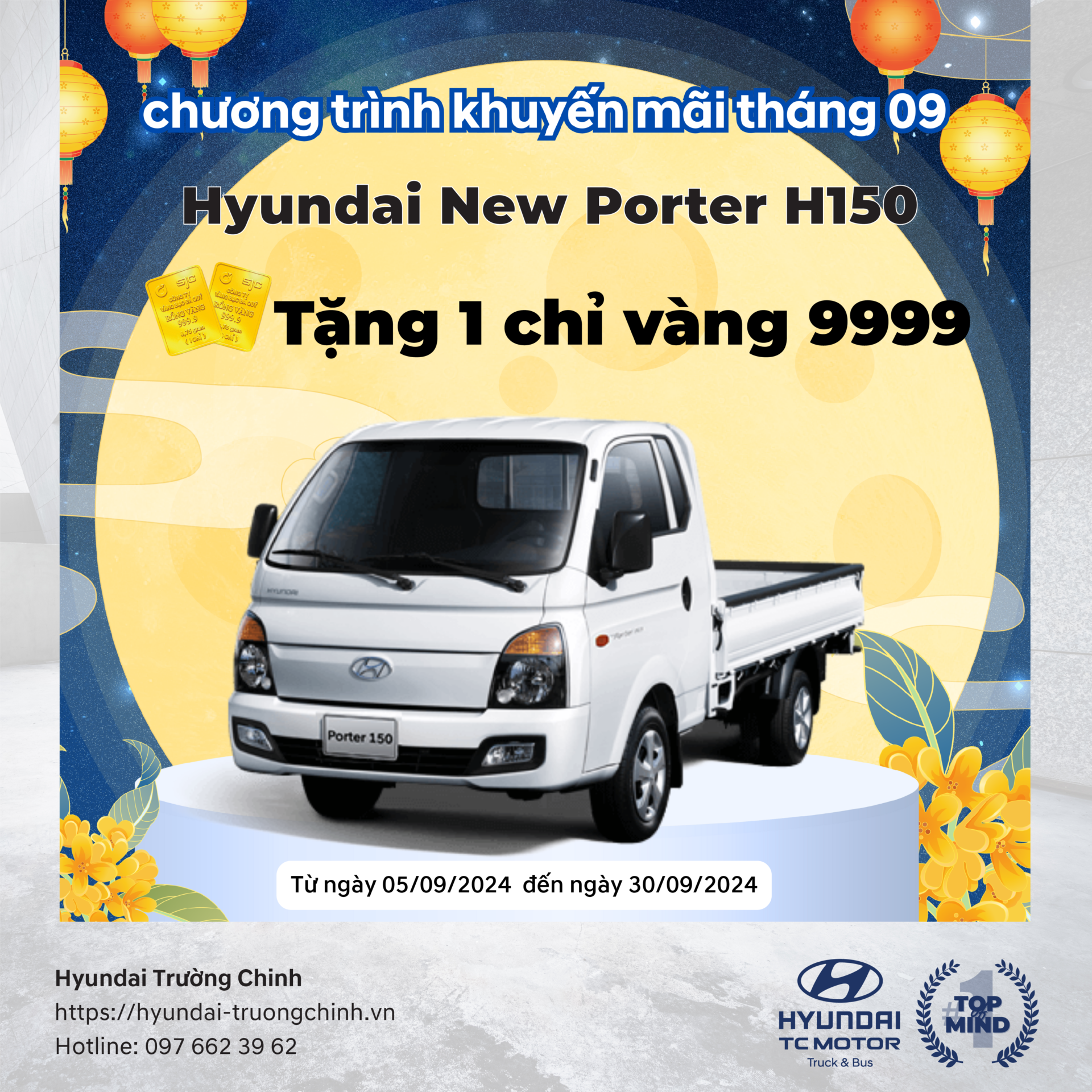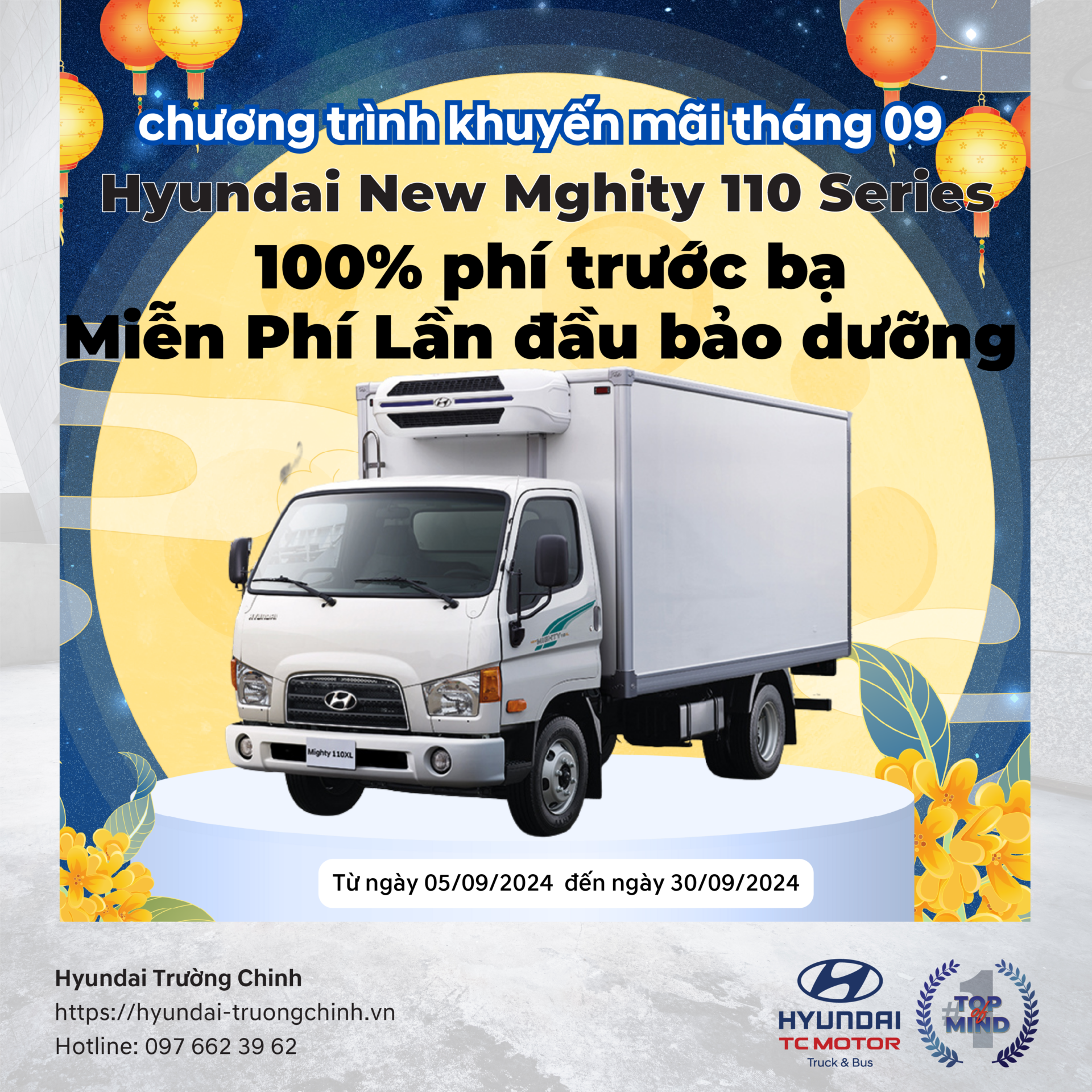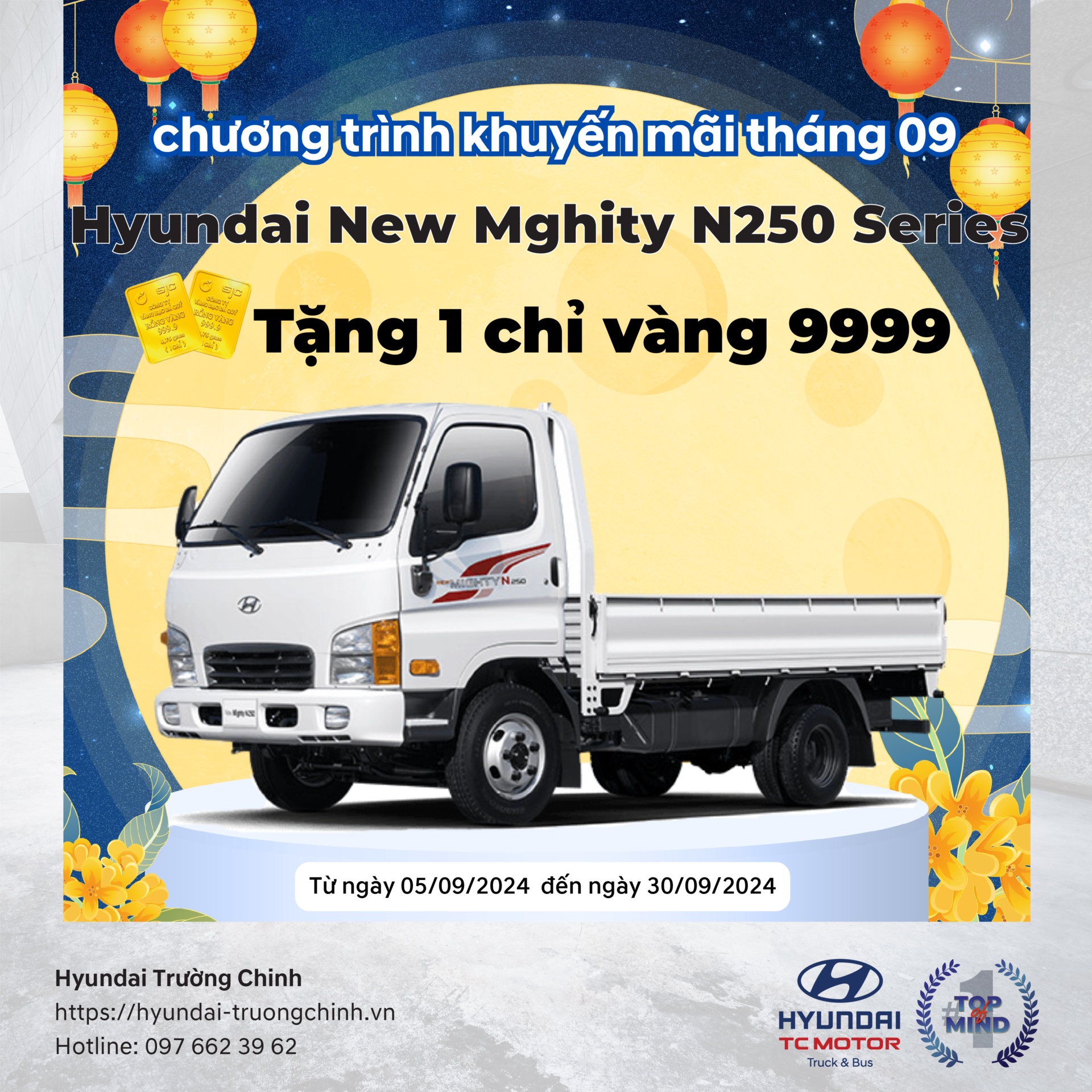 Từ ngày 05/09/2024 đến ngày 30/09/2024, Quý khách hàng mua các dòng xe tải New Mighty N250 Series, New Porter H150, New Mighty EX8 Series, New Mighty 110 Series tại Hyundai Trường Chinh sẽ nhận được những ưu đãi như: