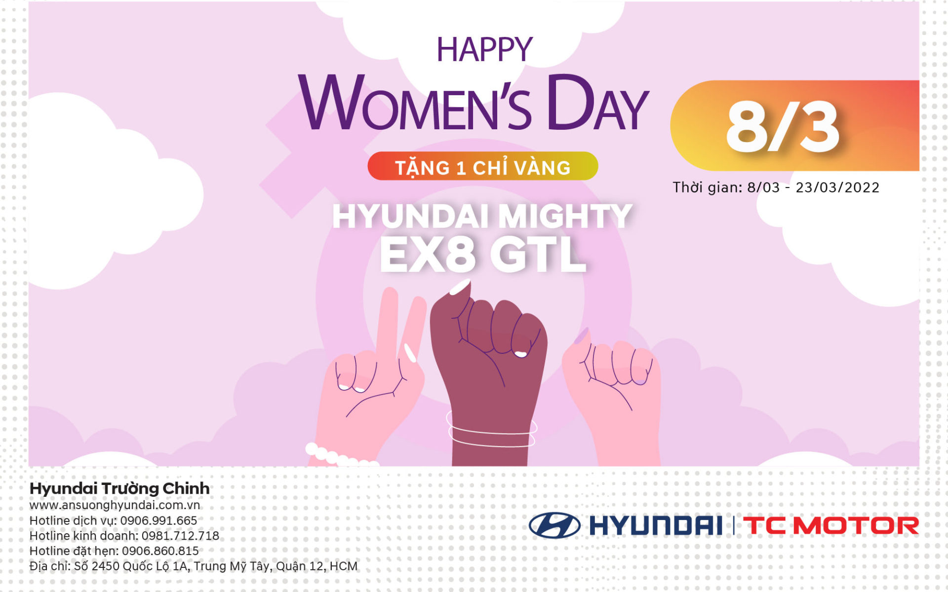 – Thời gian áp dụng: 08/03/2022 – 23/03/2022 (Chỉ áp dụng dành riêng tại Đại lý Hyundai Tải Trường Chinh).