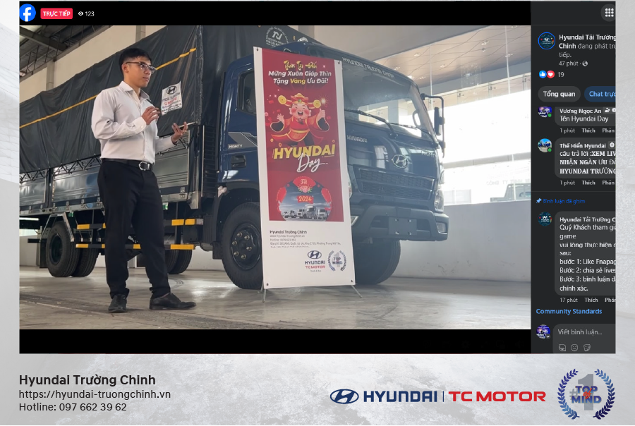 123 chính là số người xe livestream cùng lúc trong chương trình livestream Hyundai’s Day đầu tiên. Đây là con số có thể không lớn nhưng là kỷ lục tại Hyundai Tải Trường Chinh.