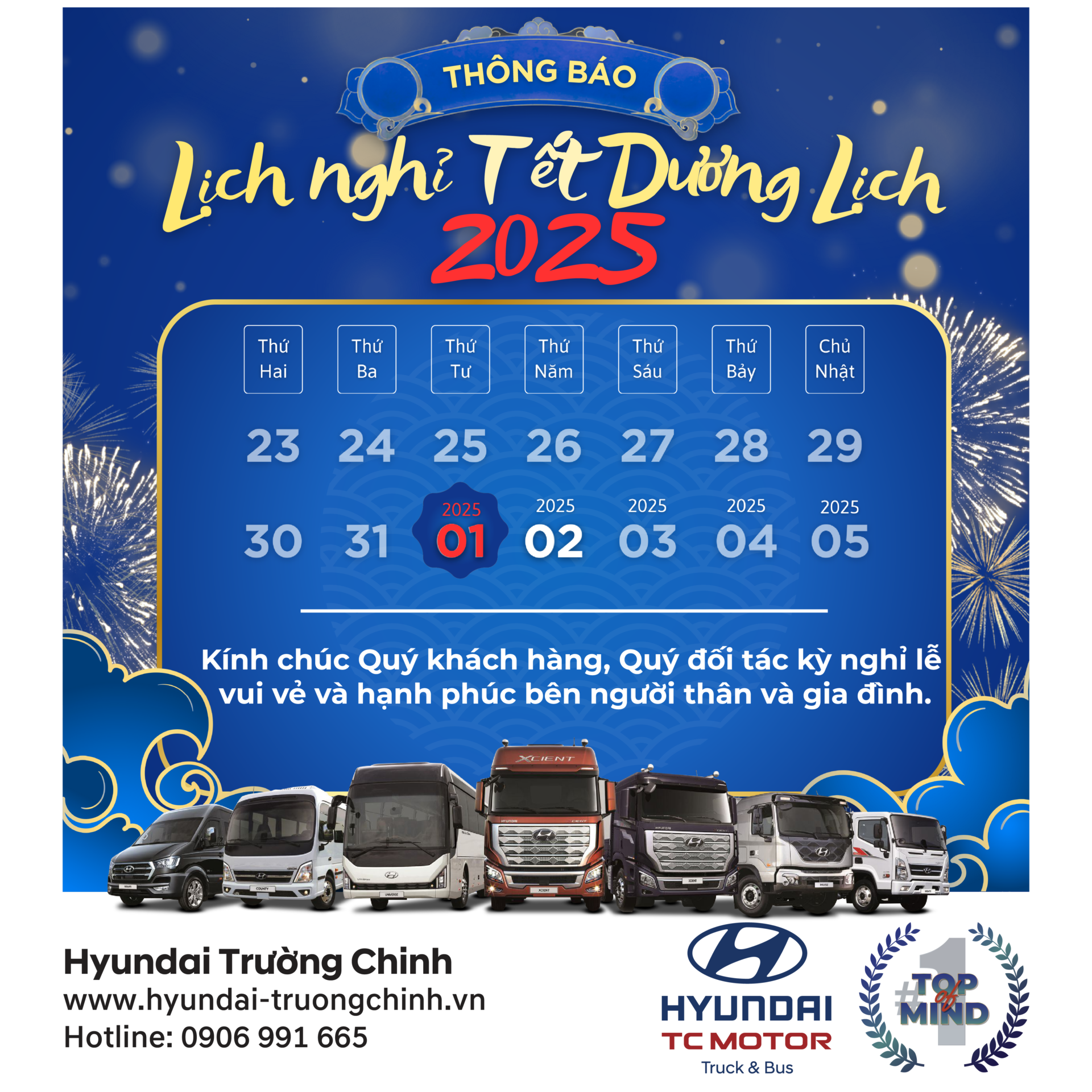 Hyundai Trường Chinh thông báo đến Quý khách hàng, Quý đối tác về lịch nghỉ tết dương lịch 2025 như sau: – Thời gian nghỉ: thứ 4, ngày 01/01/2025. – Thời gian Trở lại làm việc: thứ 05 ngày 02/01/2025. Trong thời gian nghỉ tết dương lịch Quý khách hàng có nhu cầu tư vấn…