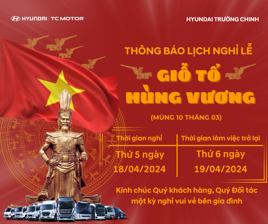 Hyundai Tải Trường Chinh trân trọng thông báo đến quý khách hàng, quý đối tác lịch nghỉ lễ giỗ tổ Hùng Vương 2024 (mùng 10 tháng 03 âm lịch) như sau: Thời gian nghỉ lễ: thứ 5, ngày 18/04/2024 (mùng 10 tháng 03 âm lịch). Thời gian trở lại làm việc: Thứ 6, ngày 19/04/2024.…