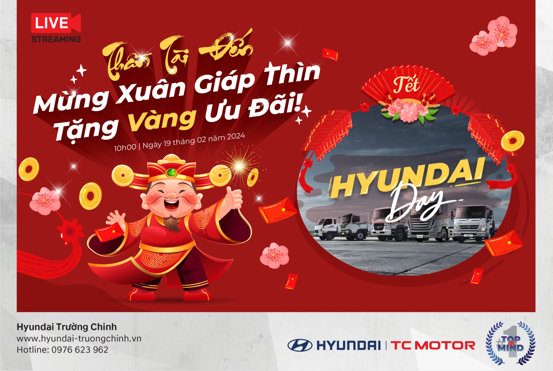 Hyundai Tải Trường Chinh xin thông báo đên quý khách hàng, quý đối tác lịch nghỉ tết nguyên đán năm 2024 như sau: Thời gian nghỉ tết: Từ ngày 08/02/2024 (nhằm ngày 29 tết) – đến hết ngày 14/02/2024 (nhằm ngày mùng 05 tết) Thời gian làm việc trở lại: 15/02/2024 (nhằm ngày mùng 06…