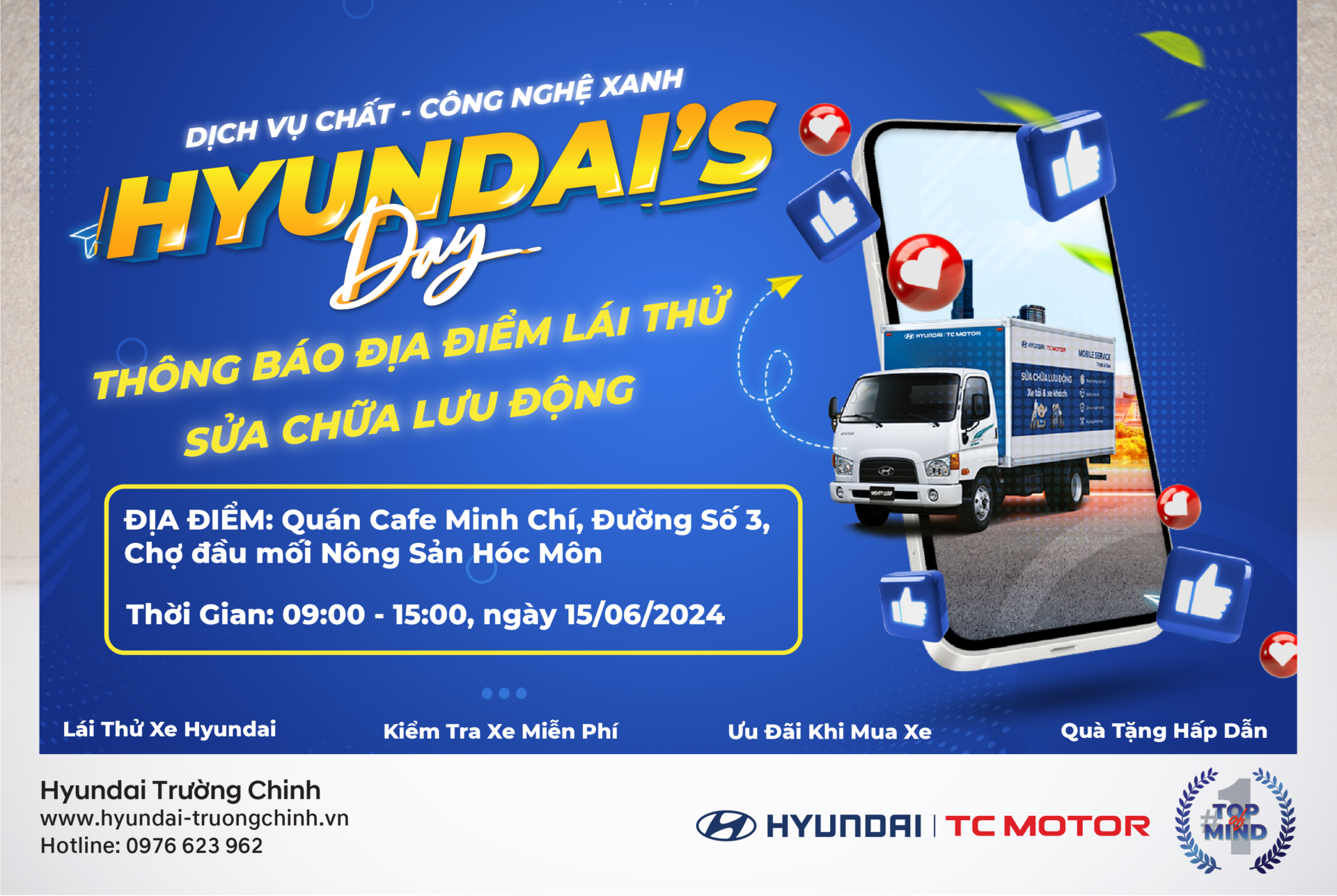 CHƯƠNG TRÌNH LÁI THỬ – SỬA CHỮA LƯU ĐỘNG 09:00 – 15:00 ngày 15/06/2024 tại chợ đấu mối Hóc Môn diễn ra chương trình lái thử và sửa chữa lưu động với nhiều ưu đãi cực kỳ hấp dẫn. Đến với Chương trình Hyundai’s Day “Dịch vụ chất – công nghệ xanh” quý khách sẽ…