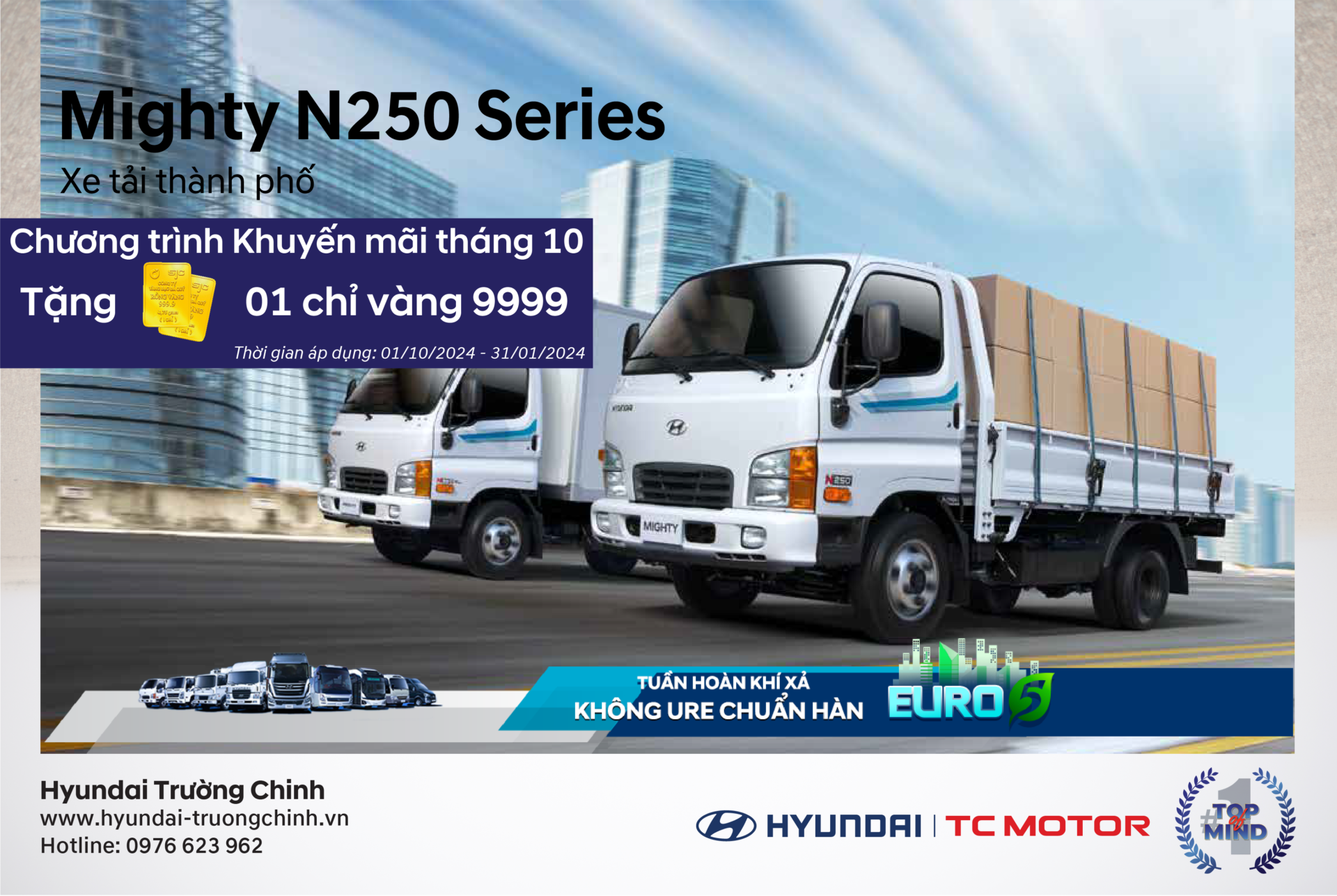 Tháng cuối cùng của năm 2024 Hyundai Trường Chinh ưu đãi ngập tràng với các dòng xe siêu hot từ xe tải đến xe khách. Quý khách hàng có thể nhận được ưu đãi lên đến 20 triệu đồng khi ký hợp đồng mua các dòng xe như: New Porter H150, Mighty N250 Series, Mighty…