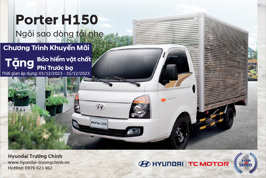 NEW PORTER H150 được mệnh danh là ngôi sao dòng tải nhẹ, mạnh mẻ và hiện đại nhất trong phân khúc 1,5 tấn, với động cơ D4CB mạnh bật nhất phân khúc, đóng được đa dạng loại thùng. Trong tháng 12 này khi mua xe Porter H150 tại Hyundai Tải Trường Chinh quý khách hàng…
