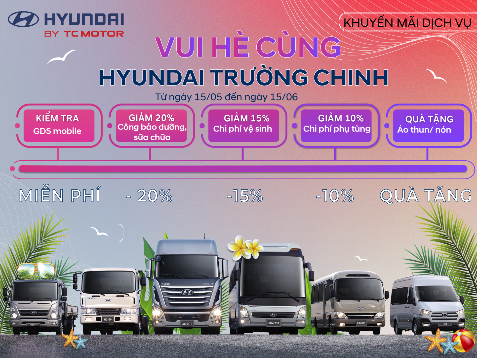 [KHUYẾN MÃI DỊCH VỤ] VUI HÈ CÙNG HYUNDAI TRƯỜNG CHINH từ ngày 15/05 đến ngày 15/06: Miễn phí kiểm tra GDS Mobile GIảm giá 10% giá niêm yết cho toàn bộ phụ tùng Giảm 20% công bảo dưỡng và sửa chữa chung Giảm 15% gói dịch vụ vệ sinh Kim phun và Buồng đốt Quà…